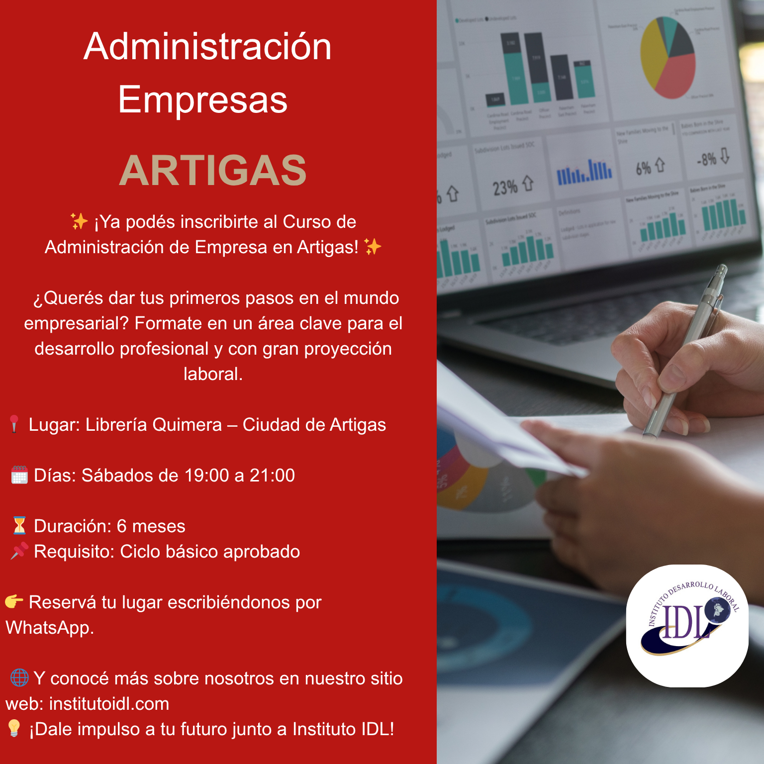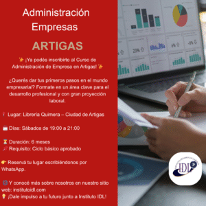✨ ¡Ya podés inscribirte al Curso de Administración de Empresa en Artigas! ✨ ¿Querés dar tus primeros pasos en el mundo empresarial? Formate en un área clave para el desarrollo profesional y con gran proyección laboral. 📍 Lugar: Librería Quimera – Ciudad de Artigas 🗓 Días: Sábados de 19:00 a
